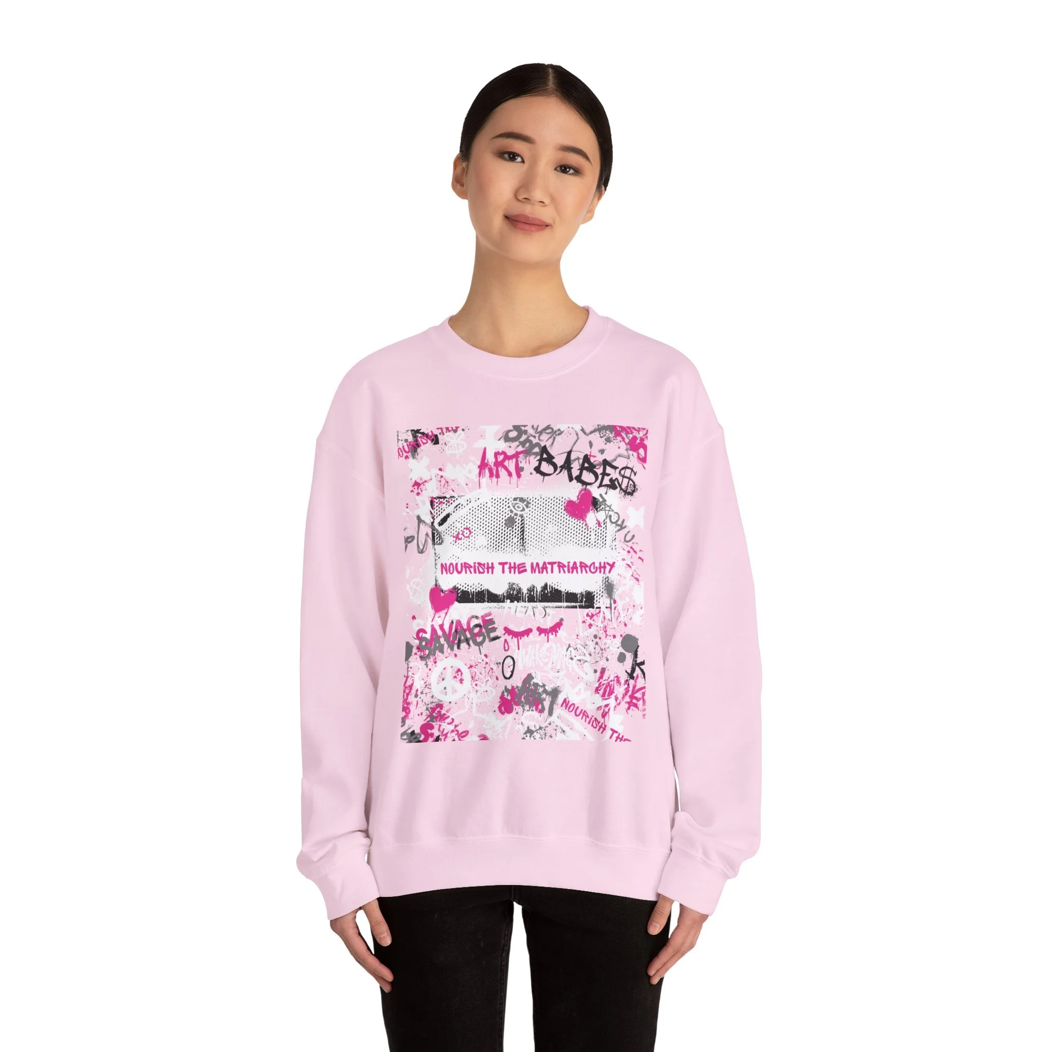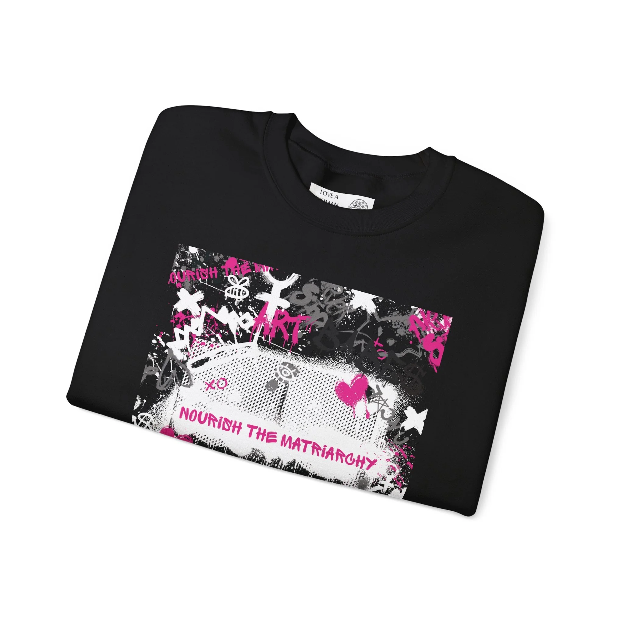 Wear this crewneck like a statement — soft, slightly oversized, and layered with rebel energy. The black cotton-poly blend creates a smooth canvas for the high-contrast graphic: distressed textures, spray-painted symbols and a burst of hot pink that reads like street art stitched into your wardrobe. It sits warm and structured at the shoulders, then relaxes into a classic fit that’s easy to throw on for late-night walks, record-store runs, or hanging out with friends who get the same offbeat vibe. The print and embroidery options add subtle tactile detail while the tear-away label keeps the neckline comfortable. This sweatshirt feels lived-in from the first wear, carrying that gritty, DIY spirit into everyday outfits.